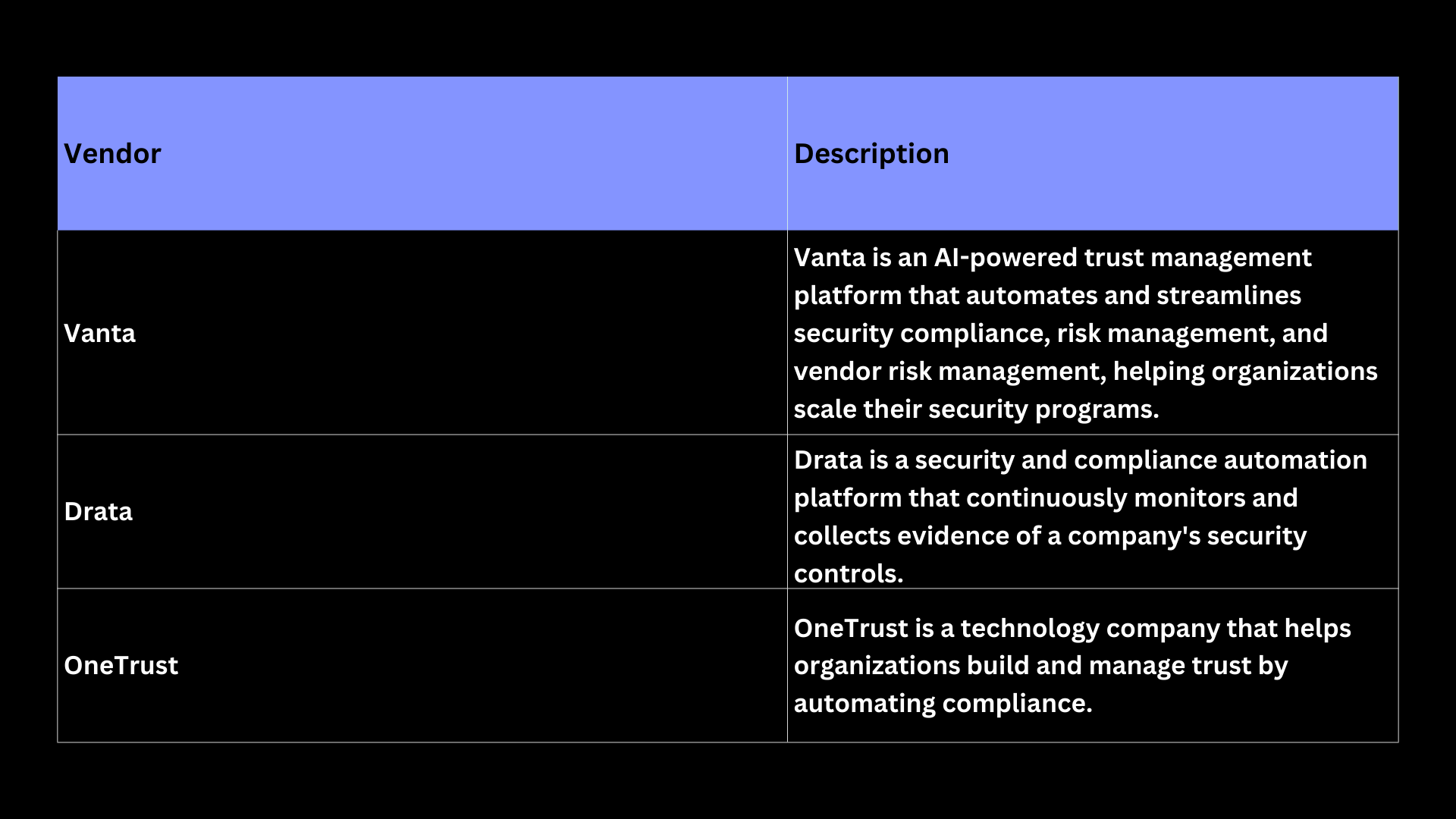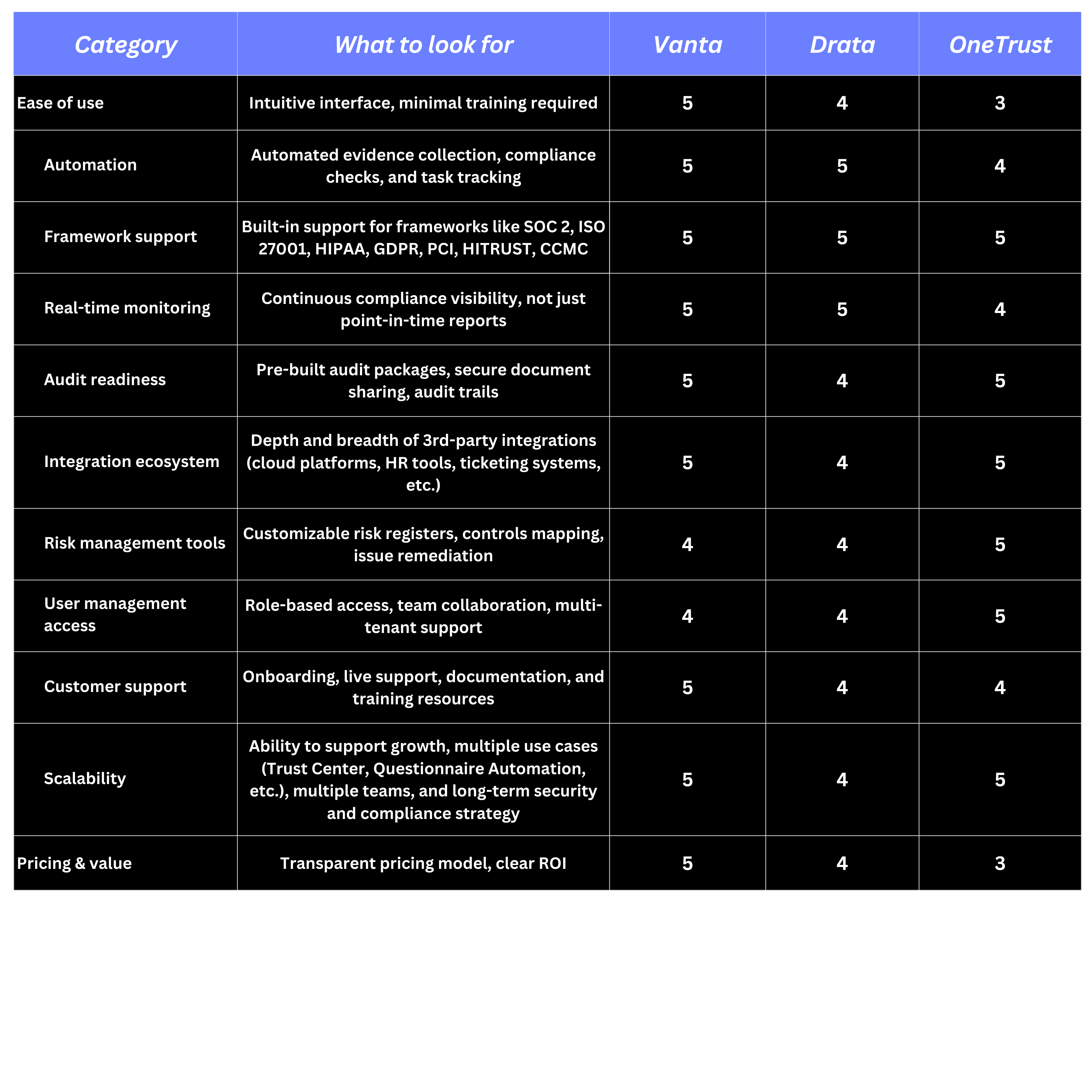 Based on our evaluation, Vanta is our top recommendation due to its:
